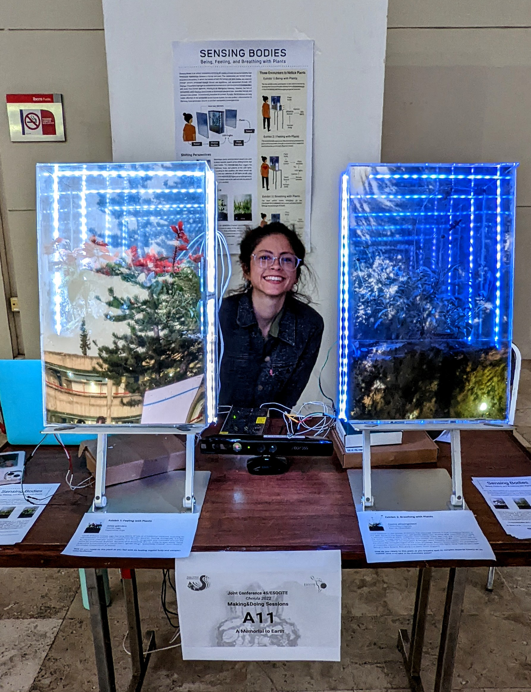 Sensing Bodies is a multi-species interactive experience that integrates plants, biosensors, and data displays with tangible embodied interaction design to examine the sociopolitical entanglements of plants. The installation features a series of interactive exhibits that showcase unique plants from local landscapes and invite different embodied connections. Biodata displays represent embodied encounters as co-created with more-than-human agencies, highlighting reciprocal people-plant relationships while fostering a deeper sensibility toward colonial histories of local landscapes.