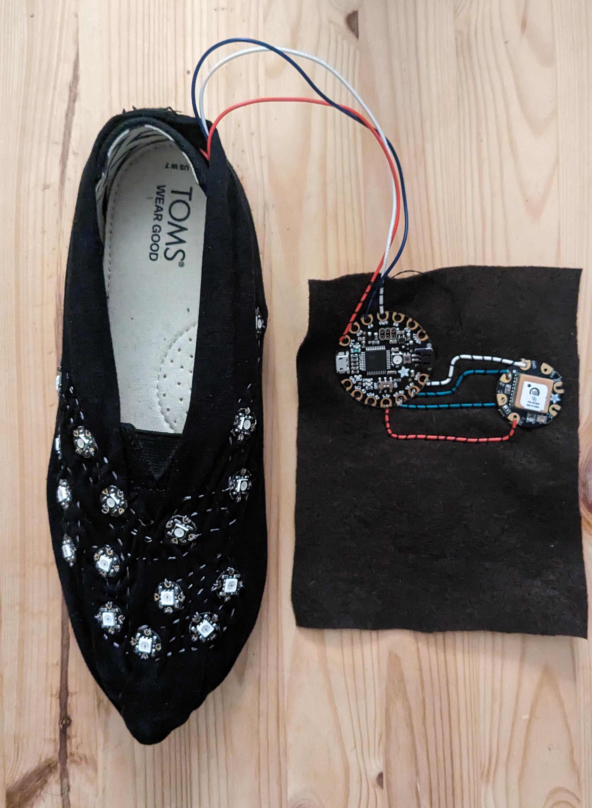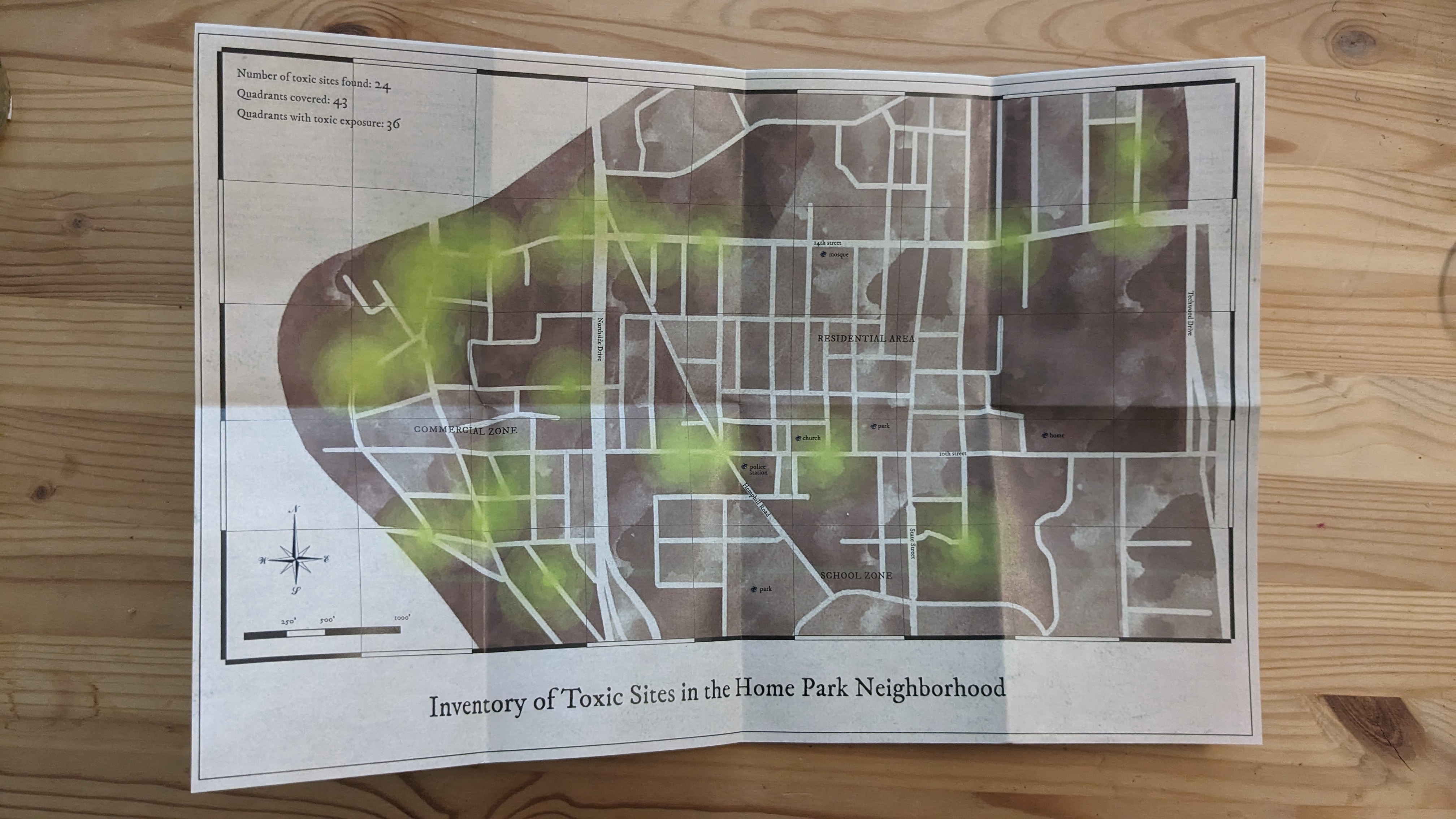 This project presents a set of artifacts as a speculative fabulation that reorients relations to environmental toxicity, centering environmental illness narratives. Specifically, “Ray-Flats” is a speculative pollution sensing shoe that “glows” in proximity to toxic sites in Atlanta, achieved with a GPS sensor, LED lights, and mapped to coordinates of land pollution data taken from EPA databases. Alongside the shoe is a navigational guide that shares the mythos of the shoe and provides alternative mappings of toxicity. The project aims to highlight both the lived reality of people with environmental illness, in which feeling and negotiating pollution is always already a part of daily life, while foregrounding their expertise in navigating toxicity, sensing precarity, and ”staying with the trouble” of living in a polluted world.